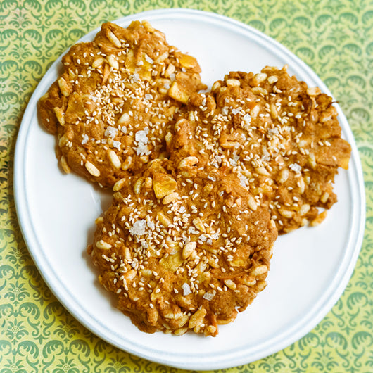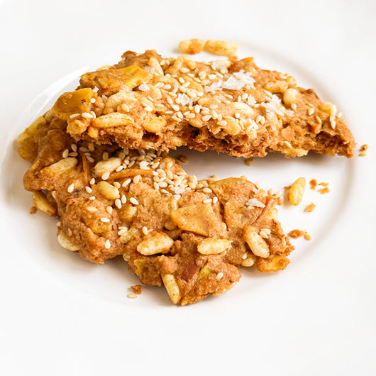 Lovers of crunchy-munchy crispy cookies, prepare to indulge! Packed with banana chips, puffed rice, sesame seeds and fresh banana, these baked shortbread cookies are inspired by Thai kluay kaek (batter-fried bananas). Heaven with a tall glass of iced tea.